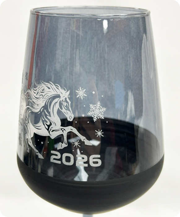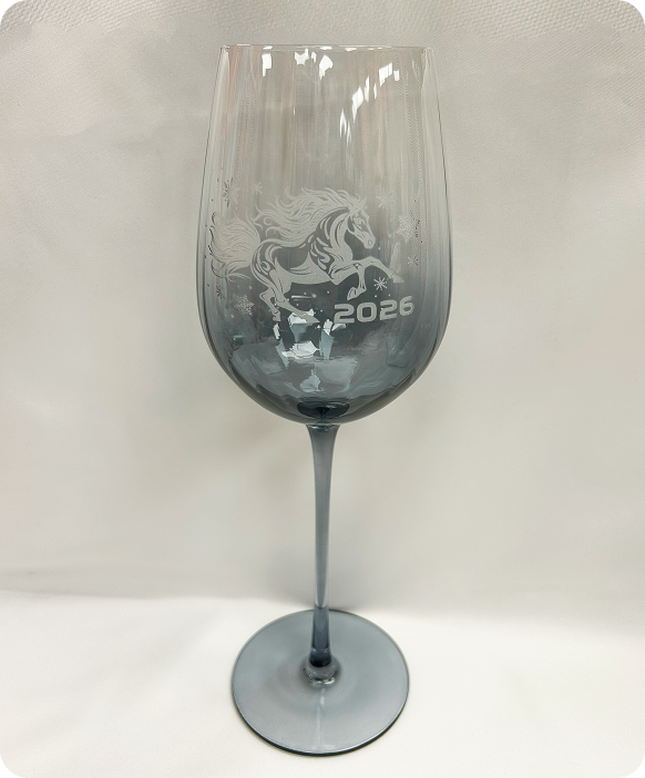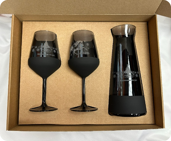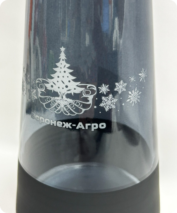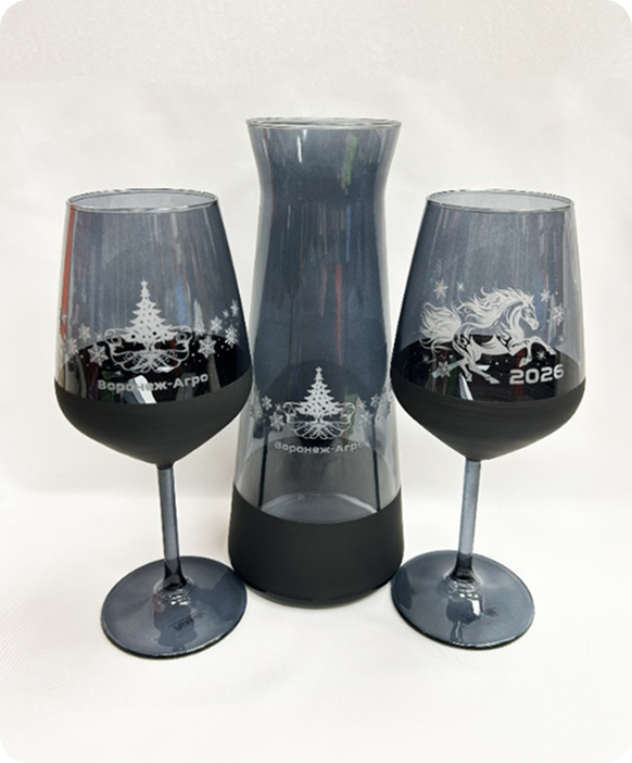 Премиум версия, включающая в себя элегантный декантер и два бокала, украшенные гравировкой логотипа компании, символом 2026 года и зимними мотивами. Такой комплект подчеркивает статус и особенность подарка, а индивидуальная гравировка делает его уникальным.