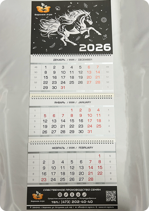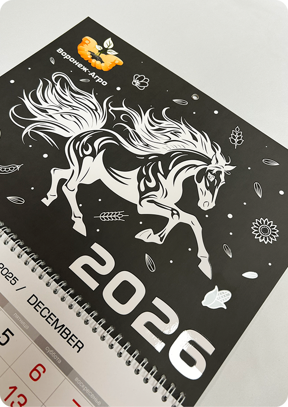 Календарь выполнен в большом формате с матовым покрытием, а для создания разных текстур - местами использована печать УФ лаком, что придает изделию интересный блеск и объемность. Сочетание различных текстур создает элегантный и дорогостоящий вид. Его дизайн выполнен в новогодней тематике, с символикой 2026 года и элементами, связанными с компанией.