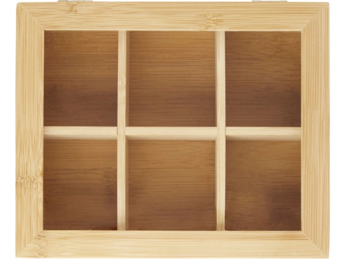 Бамбуковая коробка для чая с прозрачной стеклянной крышкой. Имеет 6 одинаковых по размеру отделений для хранения до 36 чайных пакетиков. Стекло поставляется с защитной пленкой с обеих сторон для предотвращения царапин, которую можно легко снять перед использованием. Бамбуковое дерево, Стекло.