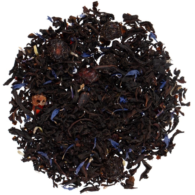 Черный цейлонский чай с ягодами вишни и лепестками василька имеет терпкий насыщенный вкус с цитрусовой кислинкой и сладкими нотками.Состав: чай черный крупнолистовой, вишня черная сушеная, цедра шиповника, лепестки василька, пищевой ароматизатор «Бергамот». Масса нетто: 50 г. Срок хранения 24 месяца.