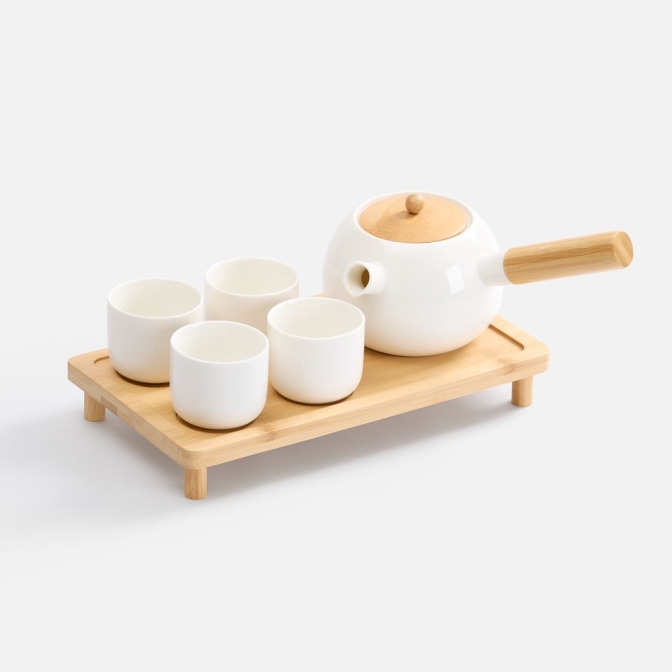 Чай — один из фундаментов японской культуры. Это символ гармонии, здоровья и традиций. С чайным набором Silencio, вдохновленным традиционным японским чаепитием, можно прикоснуться к этому удивительному искусству и погрузиться в атмосферу уютных чайных церемоний. Чайник с боковой ручкой по форме напоминает традиционный кюсю — он выглядит утонченно и элегантно и при этом оставляет полный контроль за точностью разливания чая. Вытянутая форма чашки позволяет максимально насладиться ароматом, а небольшой объем помогает напитку быстрее остыть — чтобы не обжечься при глотке. Подставка делает подачу аккуратной и защищает стол от капель.Сочетание белой глазурованной керамики и бамбука ассоциируется со спокойствием, аккуратностью и продуманным минимализмом — такое современное смешение японской эстетики и скандинавской простоты.Емкость чайника 550 мл.Емкость чашки 100 мл. В набор входят:Чайник4 чашкиПоднос для подачиНе рекомендуем мыть элементы из бамбука в посудомоечной машине.