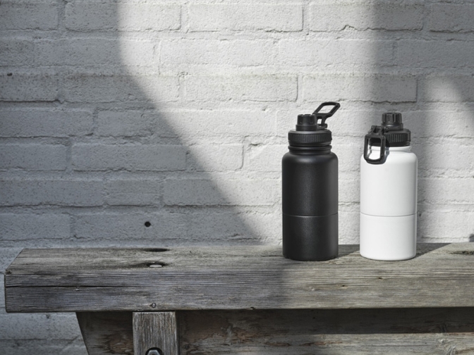 Многоразовая бутылка-термос из нержавеющей стали, сертифицированная RCS, со съемным контейнером для хранения. В верхней части бутылка имеет медный изолированный термос объемом 530 мл, который сохраняет напитки горячими или холодными в течение нескольких часов. Нижняя часть представляет собой контейнер с двойными стенками, вмещающий до 340 мл. Его можно использовать как чашку для любимых холодных напитков или для хранения закусок или других мелочей. Поставляется в подарочной коробке из переработанного картона. RCS certified recycled stainless steel, Recycled PP Plastic. Packaging: FSC Mix Credit P5.1 CU-COC-877277.