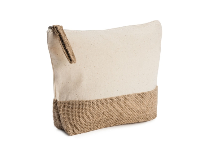 Эко-косметичка из хлопка и джута плотностью 180 г/м² натурального цвета с нижней частью и язычком из джута и застежкой-молнией в тон.