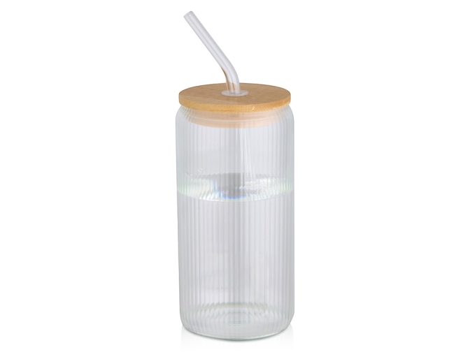 Банка из боросиликатного стекла со стеклянной трубочкой и бамбуковой крышкой. Банка имеет уникальный ребристый дизайн внутри и гладкую внешнюю поверхность, идеально подходящую для печати логотипа. Используемый бамбук выращивается в экологически чистых условиях с соблюдением принципов экологической и социальной ответственности. Поставляется в подарочной коробке из переработанного картона. Объем: 650 мл. 90% Боросиликатное стекло, 10% Бамбук с сертификатом FSC. упаковка FSC Mix 100% P5 CU-COC-877277. FSC Mix Credit N5 CU-COC-877277.