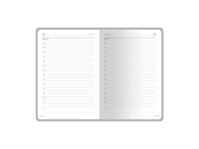 В ежедневнике Sidney Nebraska есть полезная справочная информация и телефонная книга на 18 листов, а также 272 страницы для записи идей, мыслей и составления рабочих планов. Для изготовления страниц используется качественный белый офсет повышенной плотности (70 г/кв м) с золотым срезом, который производится в Японии и подходит для всех видов чернил. Разметка блока с указанием времени позволяет планировать дела с точностью до 1 часа.
