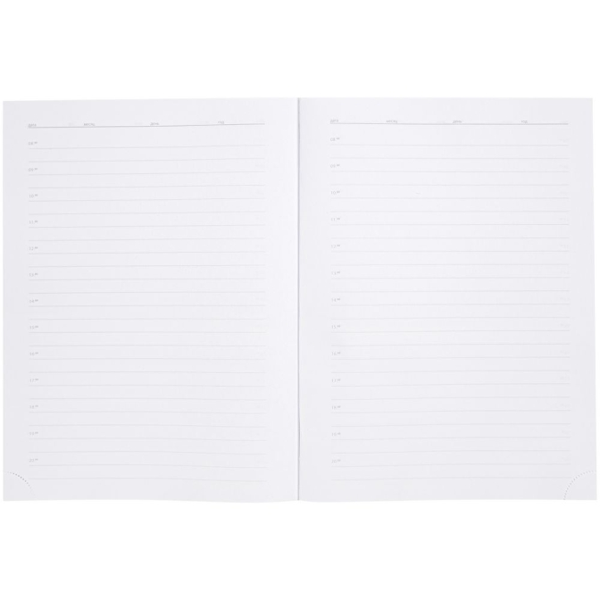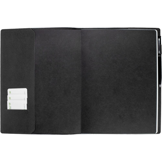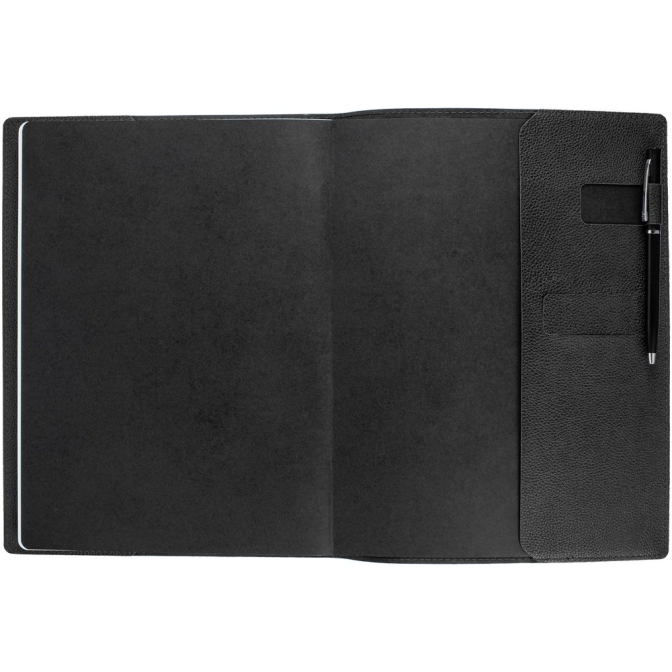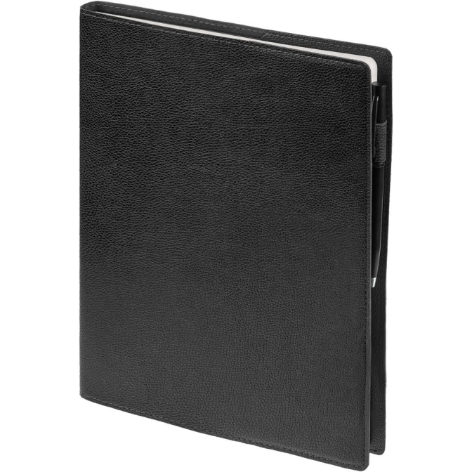 Ежедневник в суперобложке выполнен из материала La Fite, черный АА, дополнен ляссе и капталом черного цвета.Блок 925: недатированный, с информационным блоком.Кол-во страниц — 256;Бумага — белая, плотность 70 г/м²;Форзац и нахзац — черные.
