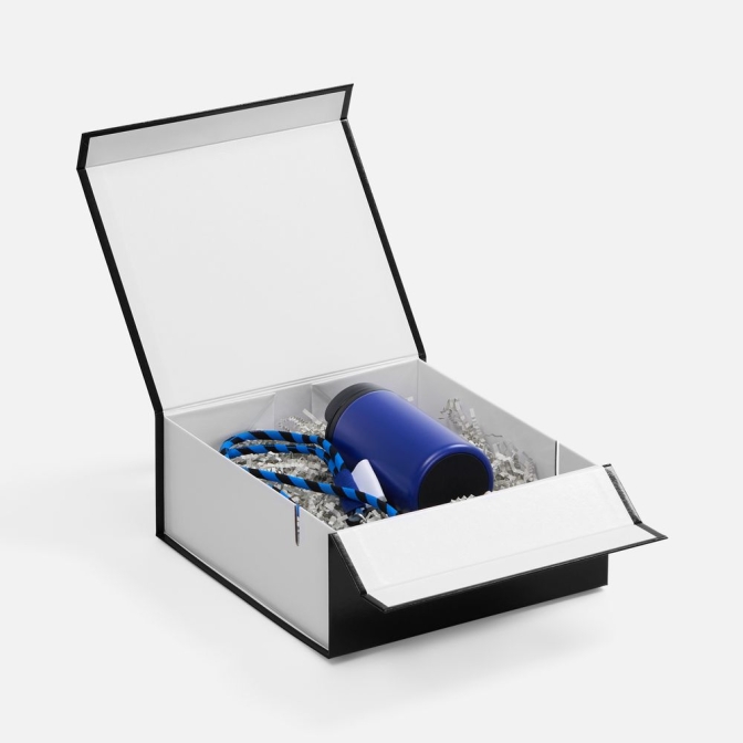 Плотная коробка из переплетного картона толщиной 2 мм с практичной конструкцией на двух створках. Складная система с уже нанесенным двусторонним скотчем позволяет быстро собрать коробку без дополнительных инструментов. Лайнер с полуглянцевым ламинированием устойчив к повреждениям и надолго сохраняет безупречный вид.Поставляется в плоском виде.