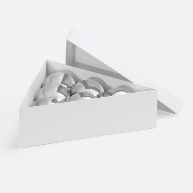 Трехгранная коробка Trigon прекрасно подходит для упаковки набора из 6 елочных шаров диаметром 10 см, а также других подарков нестандартной формы. Нетипичная форма коробки привлекает внимание и может сделать подарок более запоминающимся. Треугольник ассоциируется с динамичностью, оригинальностью и креативностью, что может стать важным элементом позиционирования.Изготовлена из переплетного картона 1,5 мм, кашированного дизайнерской бумагой TPG Metallic Soft White.Выдерживает вес до 2,5 кг.