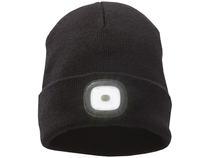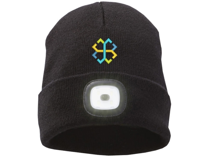 Двухслойная лыжная шапочка. Шапка с заворотом. Узор в форме дротика для плотного прилегания. Съемный и перезаряжаемый фонарь.
