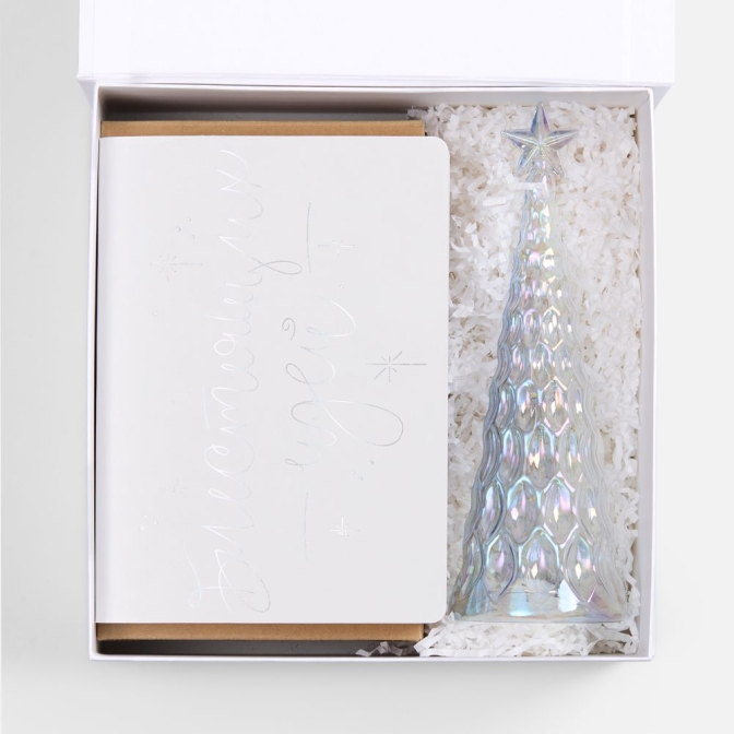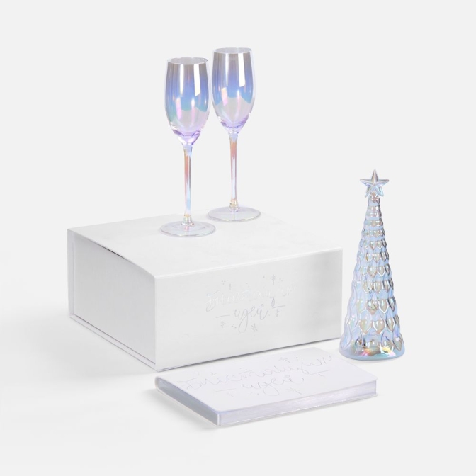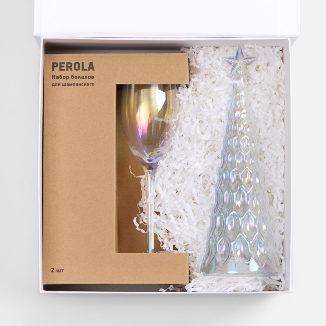 «Блестящих Идей» — самый настоящий набор-пожелание, оригинальный и невероятно атмосферный. Каждый элемент подарочного сета — чарующее воплощение этого пожелания, которое производит мгновенный вау-эффект. Главные новогодние атрибуты — необычная елочка и бокалы для шампанского, а также необходимый в течение всего года ежедневник — оформлены в едином стиле, который добавит искр и блеска как в празднование Нового года, так и в последующее выполнение привычных рабочих задач. Секрет прост: это особенное перламутровое напыление бокалов и стеклянной елочки-светильника, а еще серебристое голографическое тиснение на самой упаковке и ежедневнике с главным — и всегда актуальным — пожеланием. В такой компании блестящие идеи, без сомнения, будут посещать намного чаще, чем обычно, а весь год будет окрашен в яркие тона, искрящиеся радостью!Всем «Блестящих идей» в Новом году!В комплект входят: Набор из 2 бокалов для шампанского Perola;Светильник Frosty;Ежедневник Nebraska Flex с тиснением фольгой.Набор упакован в картонную коробку белого цвета с тиснением фольгой на клапане.