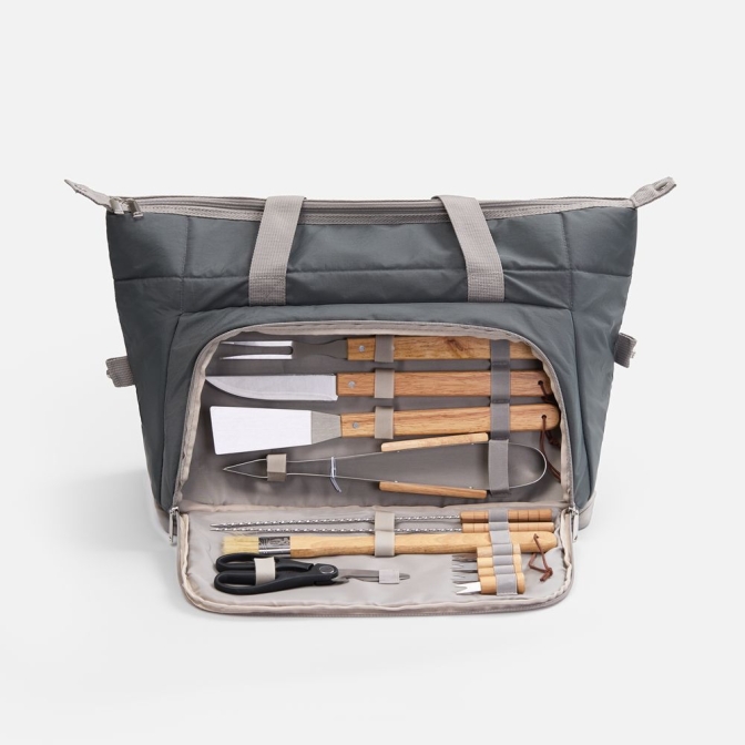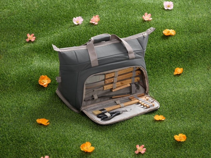 Пряный аромат готовящегося на гриле мяса никого не оставит равнодушным! Встречаем сезон гриля во всеоружии с набором Grillmoor. Grillmoor — это готовое решение для всех гурманов и любителей полакомиться мясными и овощными блюдами на гриле под открытым небом. С этим профессиональным набором для барбекю удобно отправиться за гастрономическими открытиями куда угодно.Набор укомплектован как основными, так и дополнительными инструментами для гриллинга, которые могут понадобиться при готовке или сервировке. При желании его можно комбинировать и с другими BBQ-товарами. Объемная стильная и эргономичная термосумка вместит в себя все заготовленные овощи и мясные продукты, а также сохранит их температуру до 3 часов. Покрытие с водоотталкивающим эффектом защитит содержимое от внезапного дождя, а продуманная система хранения позволит надежно зафиксировать каждый инструмент в сумке при транспортировке.Благодаря небольшому весу и удобной раскладке инструментов набор Grillmoor удобно брать с собой в загородные поездки или небольшие путешествия. Grillmoor. Сезон гриля открыт!Объем 21 л.В комплекте:Держатели для кукурузы, 4 шт.;Нож;Кулинарная кисть;Кухонные ножницы;Щипцы;Лопатка;Вилка;Шпажки для курицы, 2 шт.