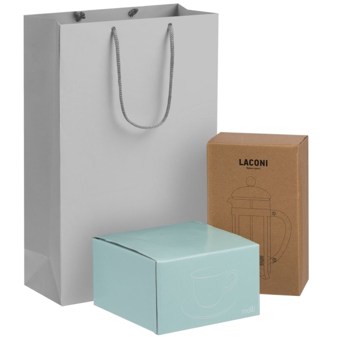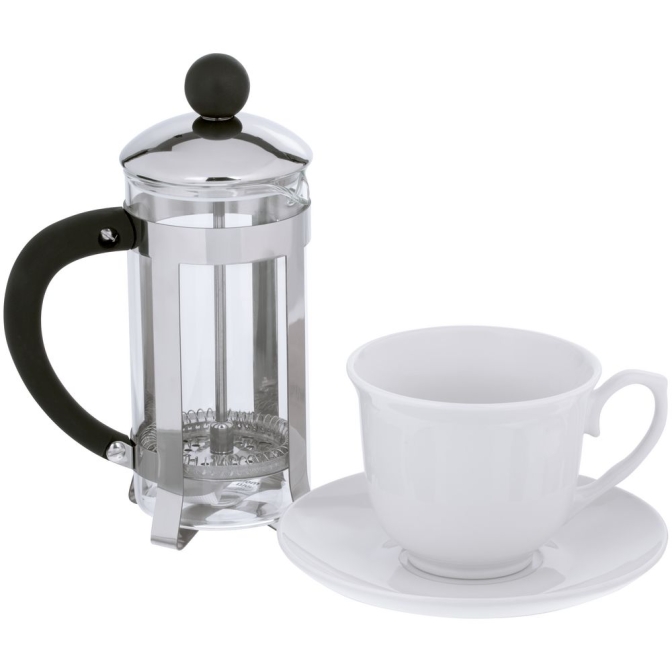 Материал: френч-пресс - боросиликатное стекло, нержавеющая сталь, пластик, чайная пара - фарфор, пакет - бумага.