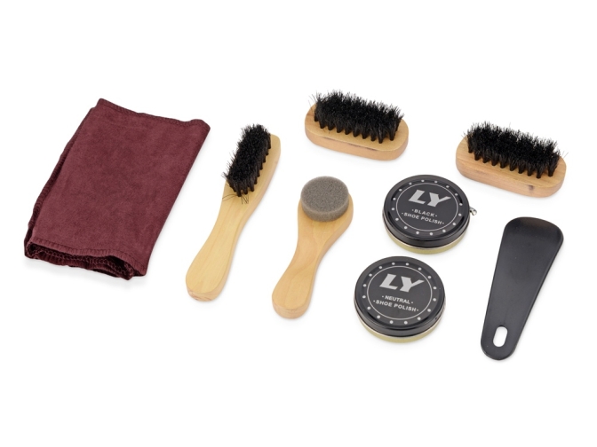 Комплектность: черный крем, бесцветный крем, 1 губка, 3 щетки, ложка для обуви, салфетка.