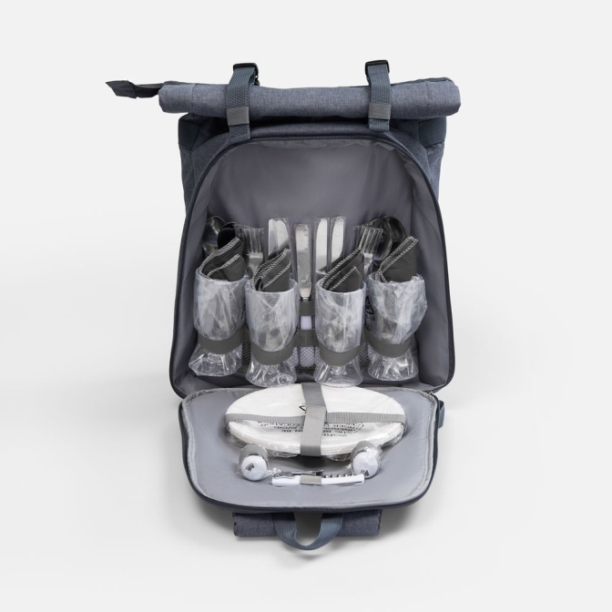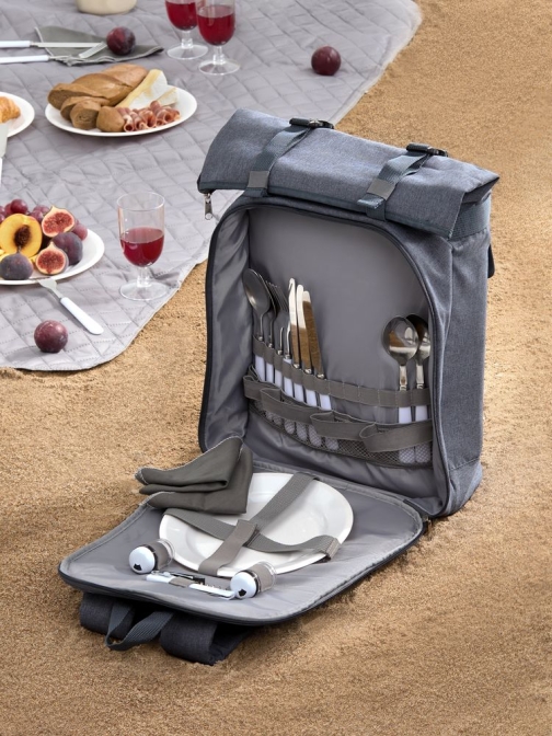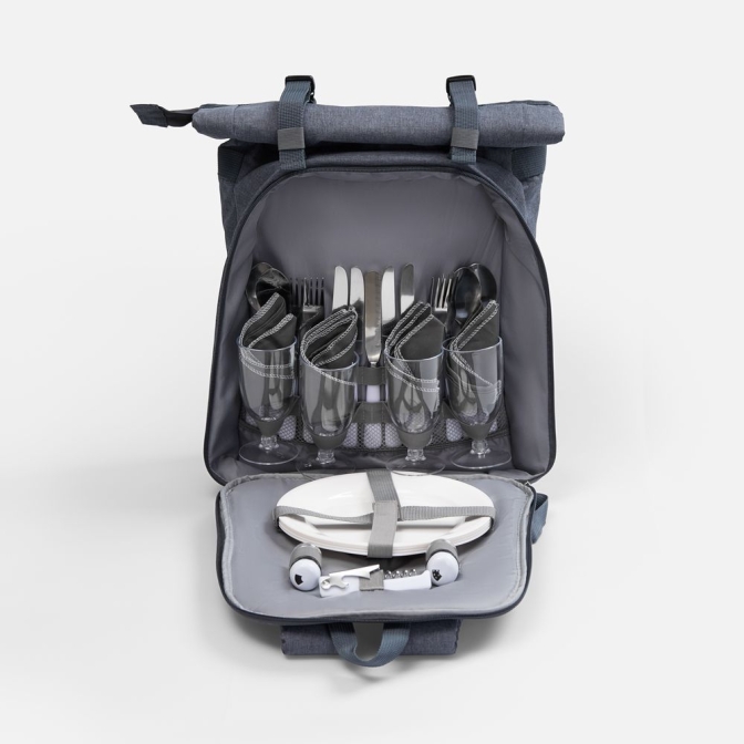 С набором Picnivo легко устроить полноценный пикник во время отдыха на природе, будь то туристический поход, кемпинг, поездка за город или на дачу. Время, проведенное в компании с Picnivo, будет посвящено любимому летнему отдыху, гастрономическим удовольствиям и конечно, радости общения — и никаких бытовых забот.Picnivo можно также использовать как набор дополнительной посуды на даче, ведь в нем есть все необходимое для небольшой компании: столовые приборы, практичные пластиковые тарелки и бокалы для вина на четыре персоны, а также нож для сыра, разделочная доска, открывалка и солонка с перечницей. Благодаря стильному рюкзаку набор Picnivo всегда удобно захватить с собой, чтобы сытно перекусить в любой момент своего увлекательного путешествия в диких условиях. Рюкзак оснащен термо-отделением, которое сохранит все продукты и напитки свежими и поддержит необходимую температуру блюд.Рюкзак изготовлен из переработанного пластика, что немаловажно для всех, кто ценит экологичные решения.Picnivo. Ода гастрономическому эскапизму.В комплекте:4 пластиковых бокала для вина; 4 ножа; 4 вилки; 4 ложки; 4 пластиковых тарелки; Открывалка для бутылок; 4 салфетки; Солонка; Перечница; Нож для сыра.