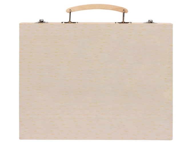 Набор из 67 предметов для рисования. Набор включает 12 акварельных красок, 12 цветных карандашей, 12 масляных пастелей, 12 фломастеров, 12 мелков, клей, резинку, точилку, карандаш HB, линейку и кисточку. Набор упакован в деревянный чемоданчик.