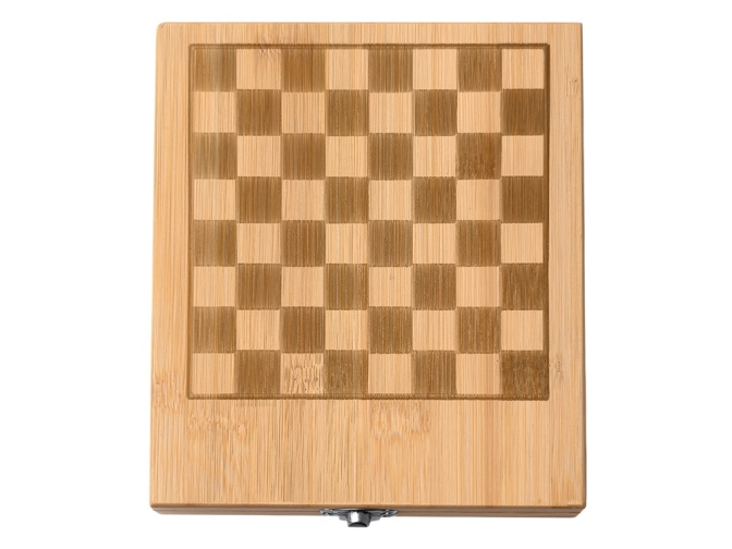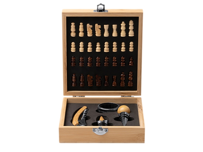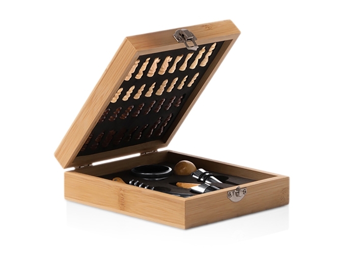 Винный набор с аксессуарами из нержавеющей стали и бамбука. Представлен в бамбуковом футляре с шахматным рисунком. Мягкая внутренняя отделка. В комплекте игровые фишки и 4 аксессуара: штопор, дозатор, крышка и кольцо для сбора капель. Поставляется в экологичной дизайнерской коробке.