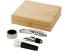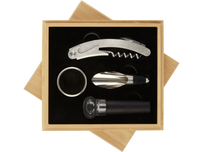 Набор для вина из 4 предметов: штопор, пробка, насадка на бутылку и кольцо. Поставляется в бамбуковой подарочной коробке, изготовленной в соответствии с экологическими стандартами.