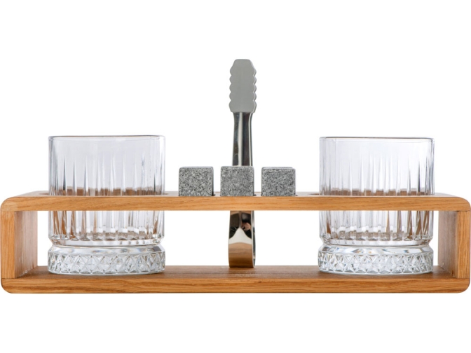 Комплектность: деревянная подставка 28 х 11,6 х 5,7 см, бокал 210 мл- 2 шт, камень для виски 2 х 2 см- 6 шт, щипцы, упаковочная коробка.