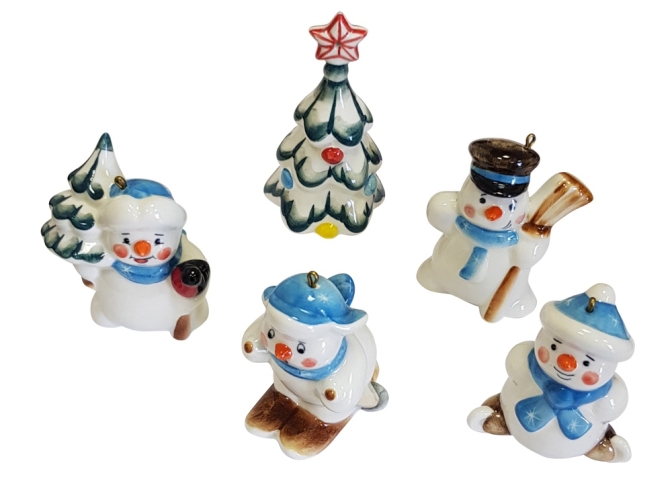 Комплектность: ёлочка 9 см, снеговик с ёлкой 7 см. снеговик на лыжах 6,5 см, снеговик с метлой 6,5 см, снеговик 6 см.