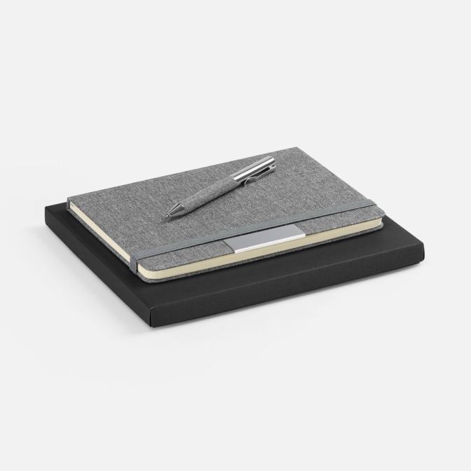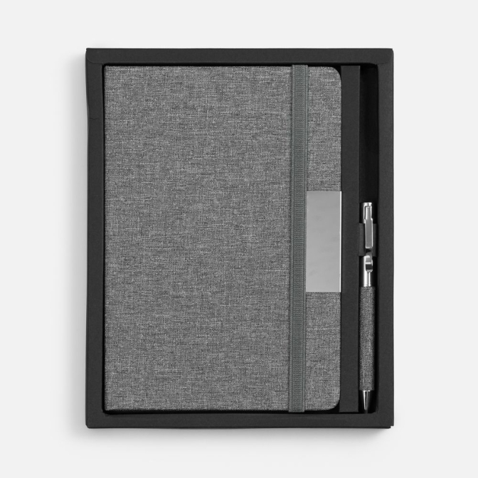 В набор входят:блокнот в линейку с металлической шильдой и резинкой металлическая ручка самосборная коробка.