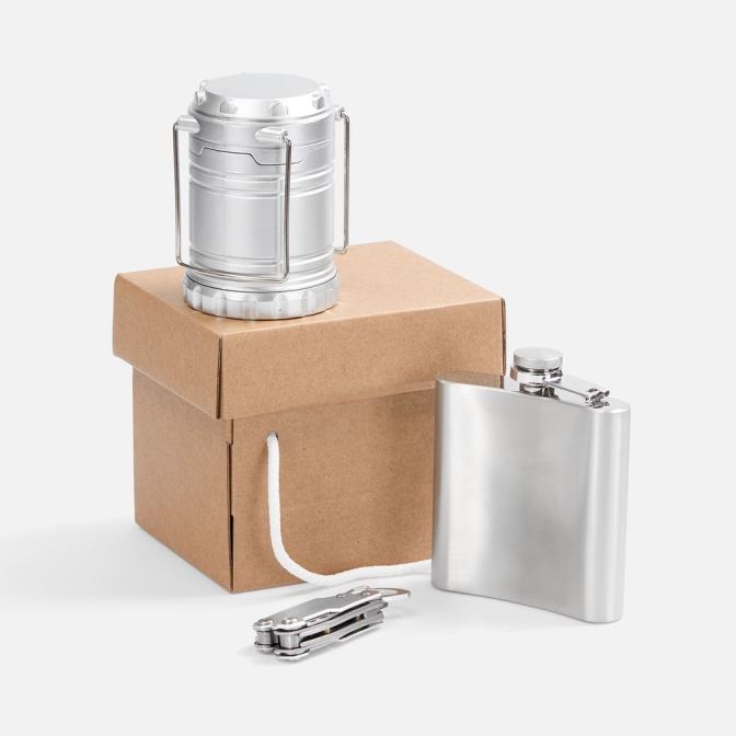 Материал: мультитул - нержавеющая сталь, алюминий, фляжка - нержавеющая сталь, 304, фонарь - абс-пластик, коробка - микрогофрокартон.
