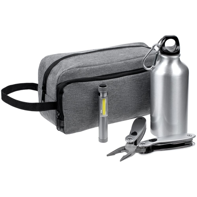 Материал: мультитул, фонарик, бутылка - алюминий, несессер - полиэстер, мультитул, фонарик, бутылка - алюминий, полиэстер. Цвет: серебристый, черный, синий.