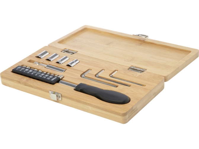 Ощутите идеальное сочетание экологичности и функциональности с набором инструментов Rivet. Этот тщательно разработанный набор инструментов не только привлекателен визуально, но и экологически безопасен без ущерба для качества и производительности. Природная прочность и долговечность бамбука гарантируют защиту ваших инструментов на долгие годы. Внутри кейса вы найдете набор из 19 необходимых инструментов, изготовленных из углеродистой стали и переработанной пластмассы: 1 длинная шарнирная ручка, 4 высококачественные насадки для различных целей, 1 удлинитель для труднодоступных мест, 10 прецизионных бит отверток для любых задач и 3 шестигранных ключа для сборки мебели. Независимо от того, являетесь ли вы любителем делать что-то своими руками или профессиональным мастером, эти инструменты рассчитаны на надежную работу и выдерживают суровые условия эксплуатации. Поскольку бамбук — природный материал, цвет и размер сырья могут быть разными, что, в свою очередь, может повлиять на итоговый вид печати. Упаковано в подарочную коробку STAC из экологически чистых источников. Carbon steel, Recycled PP Plastic.
