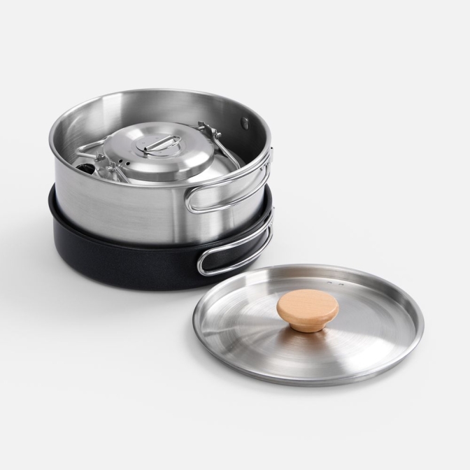 Набор компактной посуды Stackado незаменим для пикников, кемпинга, альпинизма, рыбалки и других приключений на свежем воздухе. В набор входят кастрюля, сковорода и чайник — все необходимое для полноценного приготовления блюд: от утреннего кофе до обеденного супа и ужина с жареными овощами.Посуда устойчива к перепадам температур: подходит для использования на открытом огне и при низких температурах.Благодаря тефлоновому покрытию сковороды блюда не пригорают, а чистка изделия занимает считаные минуты — достаточно протереть губкой.Продуманный дизайн набора позволяет сохранять место в походном рюкзаке: посуда со складными ручками компактно упаковывается в сетчатый чехол, который также входит в комплект. Stackado — готовь больше, бери меньше.большой котелок с крышкой — объем 1600 мл, вес 380 гсковорода с тефлоновым покрытием — объем 730 мл, вес 261 гчайник — объем 900 мл, вес 252 гсетчатый чехол