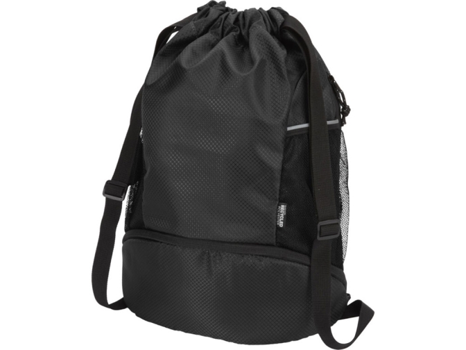 Спортивный рюкзак Доман изготовлен из переработанной ткани рипстоп, сертифицированной согласно GRS, с водоотталкивающей отделкой, подкладкой из материала RPET, сертифицированной согласно GRS, и светоотражающими элементами. Он предназначен для людей, ведущих активный образ жизни, и подходит для ежедневных занятий спортом и физических упражнений. Рюкзак имеет просторное основное отделение, в которое можно положить одежду, полотенце и даже баскетбольный мяч. Отдельное нижнее отделение позволяет хранить обувь или ношеную одежду отдельно от других вещей. Также имеет два боковых сетчатых кармана со светоотражающими деталями, один потайной карман на молнии для ценных вещей и регулируемые плечевые ремни из тесьмы для удобной переноски.