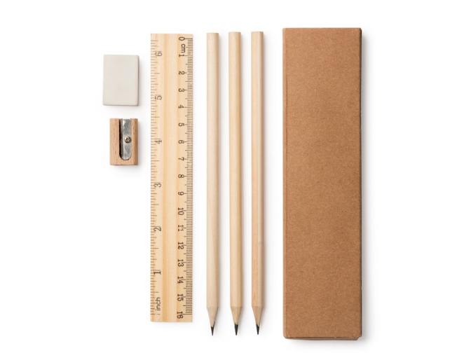 Письменный набор из натурального дерева в картонной коробке. В комплекте линейка, 3 карандаша, 1 ластик и 1 точилка.