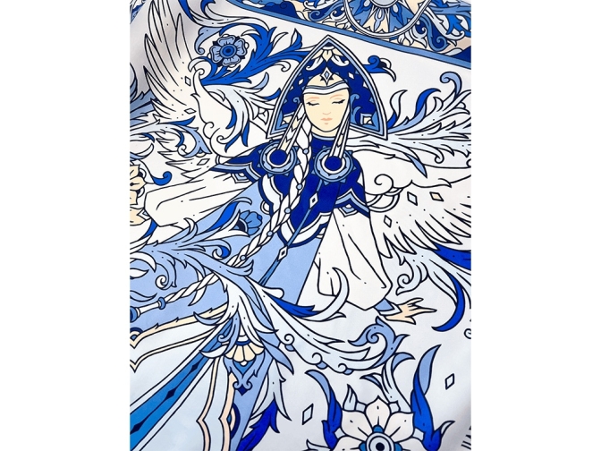 В центре авторского принта — удивительной красоты женщина с белоснежными крыльями, наделенная магическими способностями и житейской мудростью. Оригинальное сочетание тонов, цветочных орнаментов и русского колорита делают аксессуар нежным и самобытным.