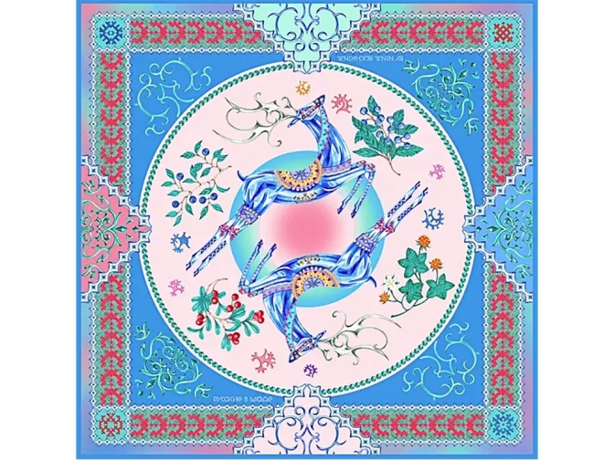 Платок обрамлен традиционными народными орнаментами – код, бережно передающийся из поколения в поколение, вобравший в себя благоговение перед могучей и прекрасной северной природой.