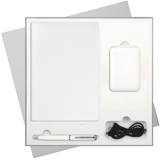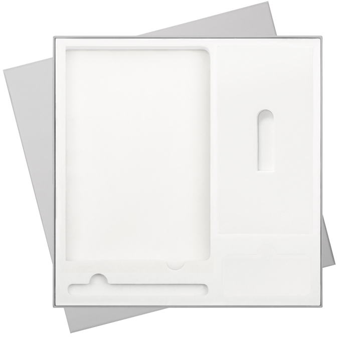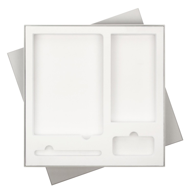 Подарочная упаковка с EVA ложементом обеспечивает расширенный выбор аксессуаров: конструкторская особенность ложемента позволяет использовать его под все виды зарядных устройств. Универсальные вырубные ячейки в точности повторяют форму аксессуаров, фиксируя их положение в коробке и обеспечивая сохранность набора. А флокированный материал ложемента, фактура которого напоминает бархат, удачно сочетается со всеми комплектующими.Материал коробки: односторонний белый переплетный картон 1,75 мм 1200 г/м2, кашированный мелованной бумагой 157 гр. с запечаткой и матовой ламинацией. Шуберы изготовлены из белой матовой мелованной бумаги 250 г г/м2.Материал ложемента: EVA + покрытие флок, молочно-белого цвета. Подложка EVA c флокированным покрытием для поддержания высоты в отделении для ручки. Лазерная вырубка отделений ложемента.