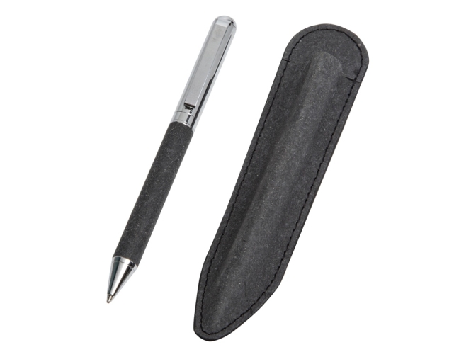 Блок блокнота - бежевого цвета с линовкой в линейку. Твёрдая обложка выполнена из переработанной кожи, как и вставка на ручке. Ручка изготовлена из переработанной стали и оснащена стержнем с эко-чернилами, при производстве которых не выделяется вредных веществ.