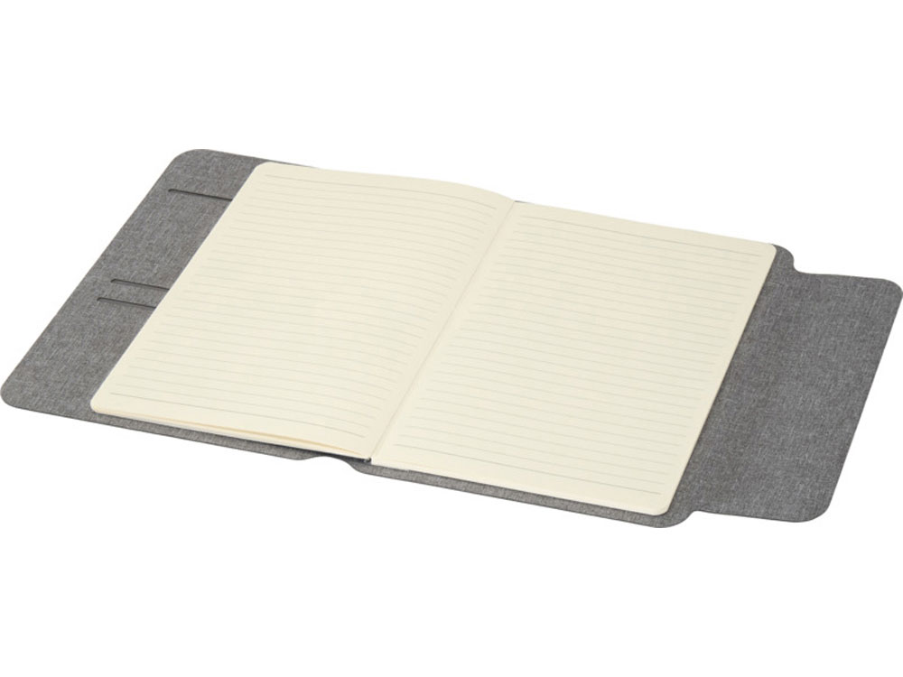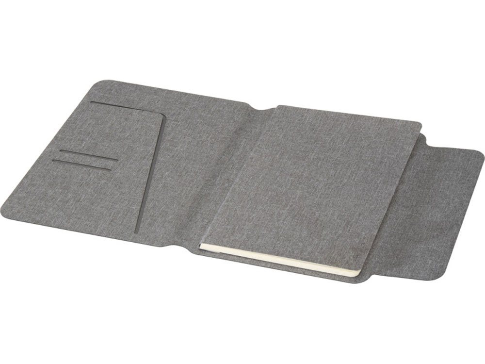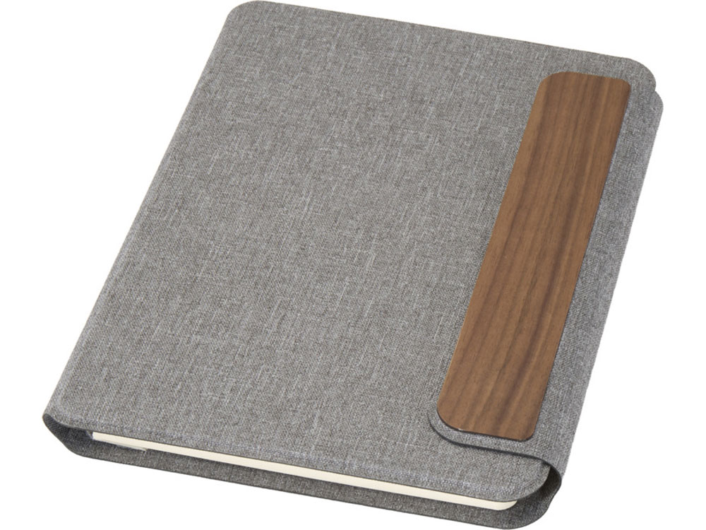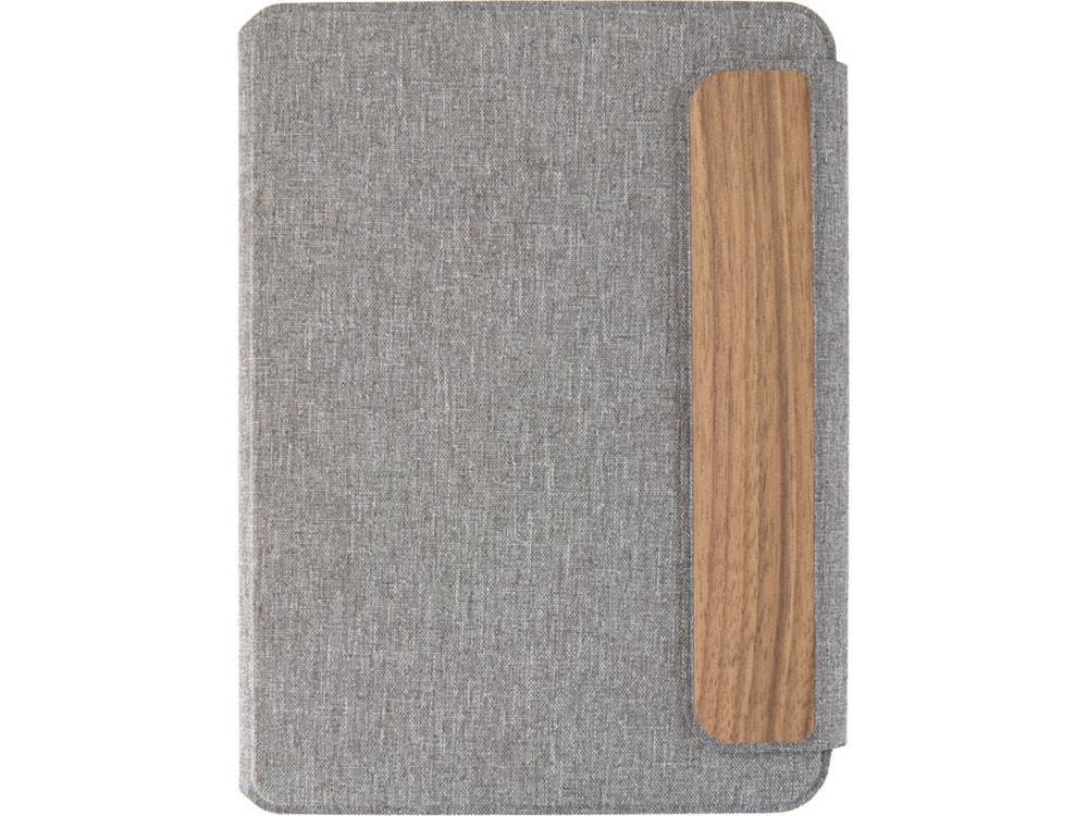 Обложка портфолио A5 Andean изготовлена из переработанного полиэстера, сертифицированного RCS, что является экологичной альтернативой стандартным материалам. Изделие имеет гладкую серую обложку с закругленными углами, а также магнитную застежку, дополненную изысканной деталью из орехового дерева, что придает ему изысканный вид. Внутри блокнот в гибкой обложке с 64 листами бумаги 80 г/м2 кремового цвета в линейку. Поставляется в шубере из крафтовой бумаги