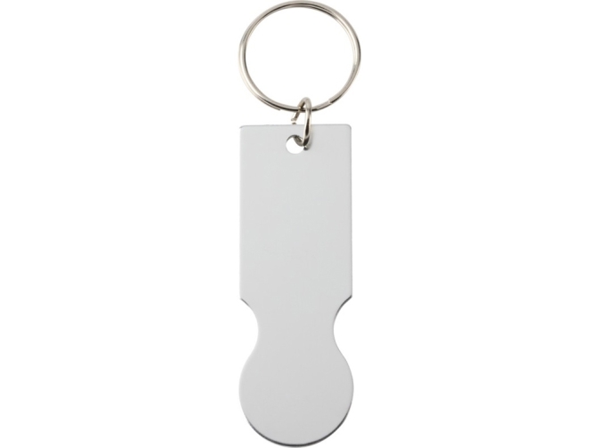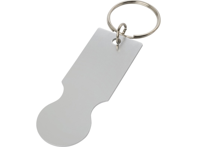 Металлический брелок для ключей Rhea с монетой для тележки предназначен для большинства тележек супермаркетов, позволяя открывать их без монет или жетонов. Сделан из переработанного алюминия.