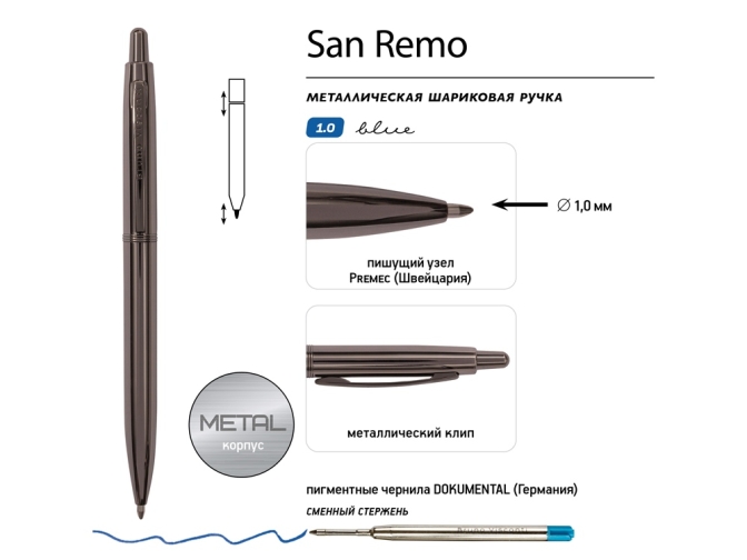 Металлическая шариковая ручка San Remo - аксессуар, призванный стать настоящим элементом стиля, подчеркнуть индивидуальность его владельца.