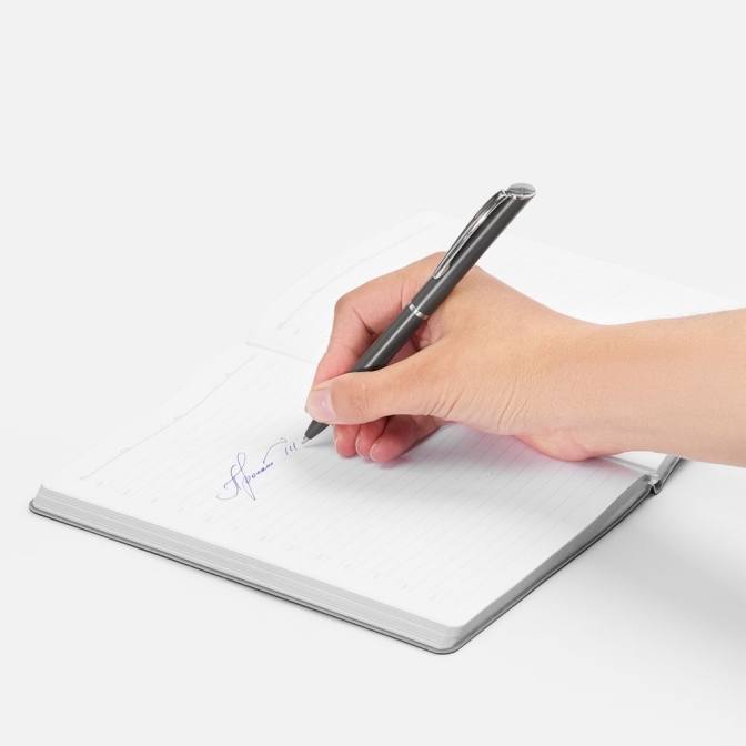 Классическая металлическая ручка с матовым покрытием и хромированными деталями.Механизм ручки: поворотный.Корпус ручки разбирается, стержень легко заменить.Стержень с синими чернилами.Длина линии письма: 800 м.Гравировка по цветным частям корпуса получается зеркальной.