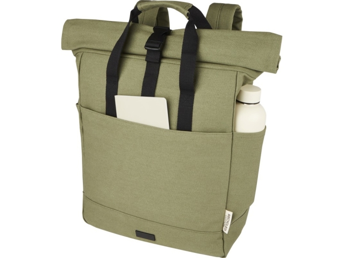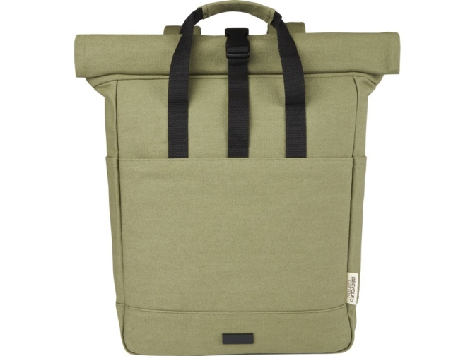 Изготовленный из высокопрочных экологичных материалов, брезента и подкладки из переработанного ПЭТ, соответствующих стандарту GRS, рюкзак Joey со сворачивающимся верхом имеет специальный чехол для планшета и отделение с подкладкой для ноутбука диагональю 15 дюймов. Рюкзак также имеет 2 боковых кармана для воды, один большой передний карман на молнии и сворачивающуюся верхнюю часть на молнии для максимальной вместимости и безопасности. Две усиленные вязанные ручки обеспечивают удобство и простоту ношения в качестве деловой сумки-тоут. Декоративная металлическая пластина может придать логотипу сияние благодаря утонченному матовому покрытию.