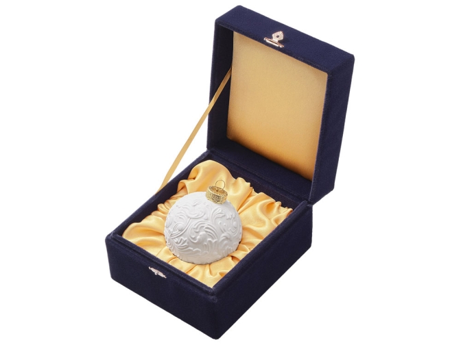 Игрушка упакована в изысканный подарочный футляр, обитый синим бархатом, что подчеркивает её ценность и делает готовым презентом для коллег и партнеров.