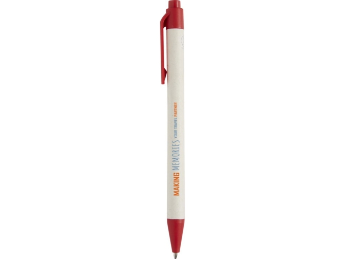 Шариковая ручка с кнопочным механизмом и корпусом из переработанных коробок из-под молока (до 70%). Кнопка, зажим и наконечник изготовлены из PLA-пластика. Картонные коробки из-под молока собираются, сортируются, перерабатываются и превращаются в бумагу, таким образом действительно превращая мусор во что-то полезное.