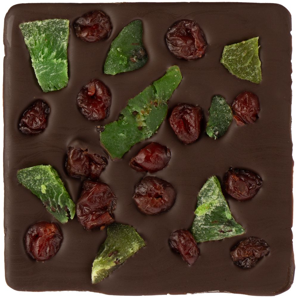 Шоколад ручной работы, изготовленный по классической бельгийской технологии, с кусочками сушеного киви и вишни.Состав: какао тертое, сахар, масло какао, эмульгатор (соевый лецитин), ванилин, вишня сушеная, киви сушеное. Темный шоколад 55%. Срок годности 12 месяцев.Вес нетто: 100 г.