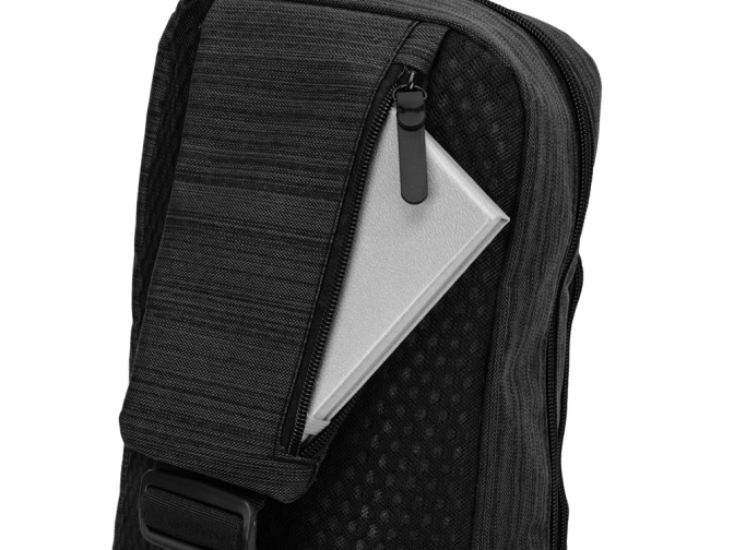 Удобная и легкая сумка на одно плечо незаменима для переноски всего необходимого. - карман на молнии на лямке для карт, - фиксация лямки для ношения слева или справа, - регулируемая по длине лямка 145 см, - сетчатая дышащая спинка, - USB порт, - ремешок из PU для дополнительного удобства, - в большом отделении: карман для планшета, органайзер, наружный карман с сетчатым карманом внутри.
