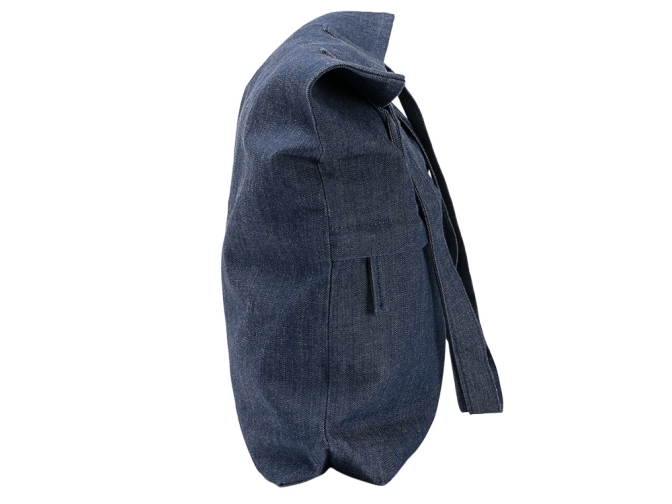 Сумка из переработанной джинсовой ткани с передним карманом на застежке. Высота ручек 29 см.