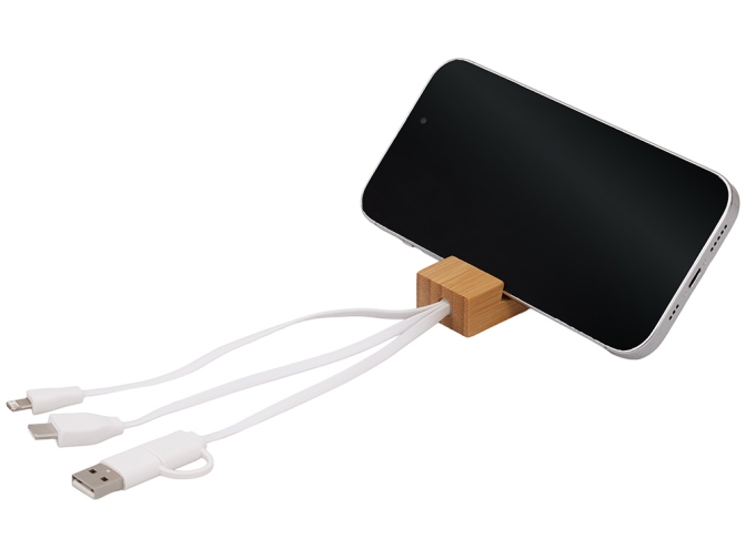 Универсальный кабель с подставкой 4-в-1 Unicable — стильное и практичное решение для современного пользователя. Этот компактный аксессуар станет незаменимым спутником в вашем кармане, сумке или на рабочем столе. Поставляется в фирменной коробке bamboo collection. Оснащён четырьмя разъёмами: • Входными разъемами USB-A и USB-C — для подключения к компьютеру, блоку питания или зарядному устройству. • USB-C — совместим с современными смартфонами, планшетами и ноутбуками. • Lightning — для некоторых устройств Apple (iPhone, iPad). Экологичный и стильный корпус из дерева Корпус кабеля выполнен из натурального бамбука — экологически чистого и прочного материала. Деревянная подставка не только защищает кабель от перегибов, но и служит удобной опорой для телефона при видеозвонках, прослушивании музыки или просмотре видео. Ключница с кольцом — всегда под рукой Специальное металлическое кольцо позволяет легко прикрепить Unicable к ключам, рюкзаку или сумке. Благодаря этому вы никогда не потеряете свой кабель — он будет всегда рядом, когда понадобится.