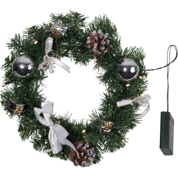 Венок еловый DECORAGE, диаметр 30 см, 10 LED ламп, на батарейках, зелёная хвоя, серебристые украшени