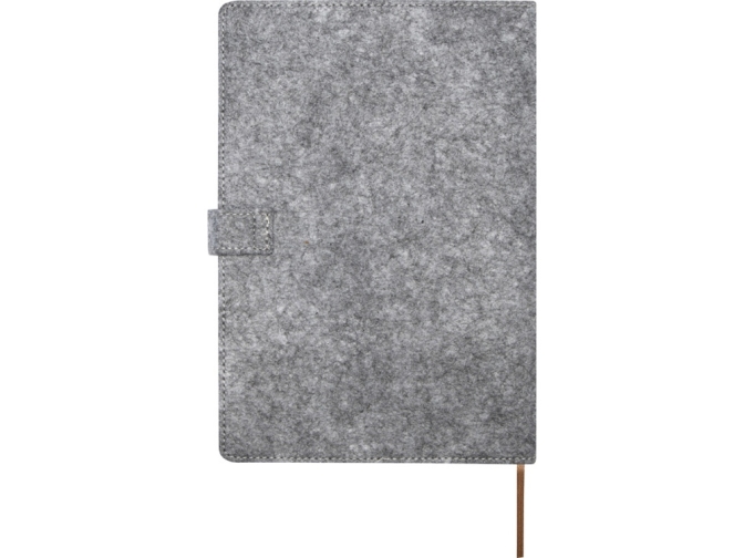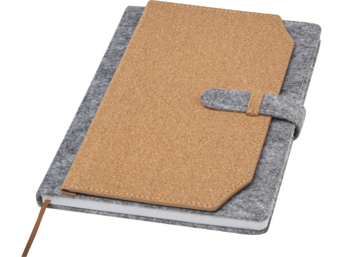 Блокнот формата А5 в твердой обложке из переработанного фетра и пробки, 80 листов бумаги плотностью 70 г/м² в линейку. Блокнот имеет 3 кармана для визиток, коричневую ленту в тон и закругленные углы. FSC certified paper, RPET felt, FSC certified cork. FSC Mix 100% P7.1 CU-COC-877277.